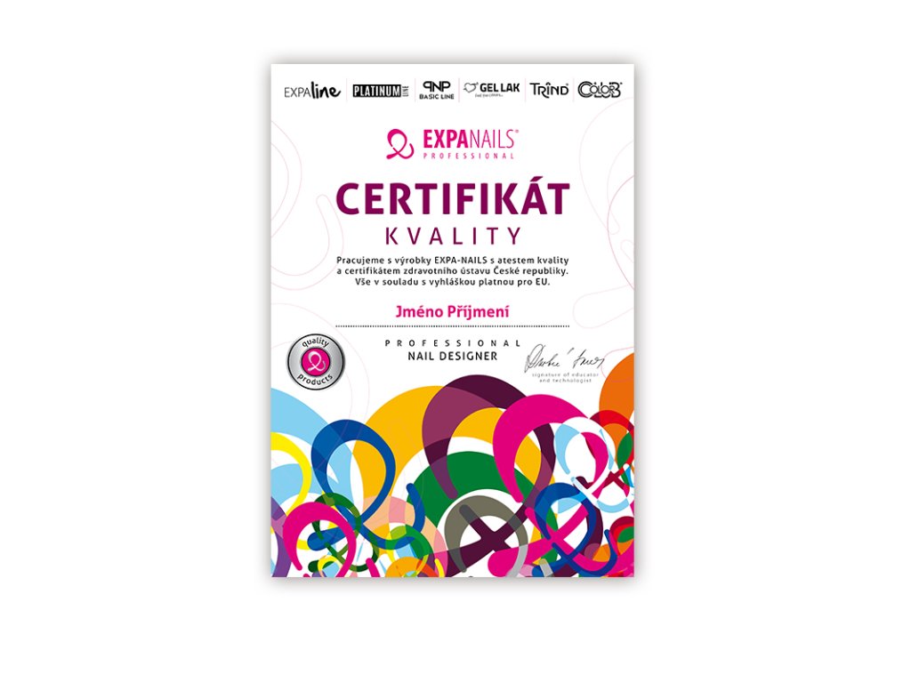 Certifikát kvality nabízíme ve 2 variantách: -bez jména a bez lamina kód: 999228 nebo 999230 -se jménem a zalaminovaný kód: 999229 nebo 999231 Klientky, které navštěvují nehtová studia, si konečně začínají uvědomovat cenu svého zdraví a vyžadují ,aby materiály, kterým pracují nehtové designérky, byly kvalitní a atestované. Vaše studio tímto certifikátem získá punc kvality