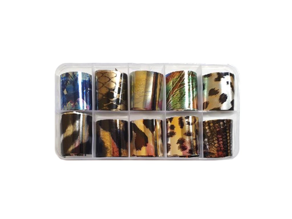 Zdobící fólie v boxu, ve kterém je 10ks fólií různých motivů. Rozměr jednotlivé fólie: (2,4 x 100cm) Doporučujeme použít FOIL Clear gel 111201, který zapečete 30-45 sekund a můžete obtisknout fólii.