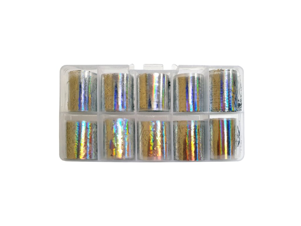 Zdobící fólie v boxu, ve kterém je 10ks fólií různých motivů. Rozměr jednotlivé fólie: (2,4 x 100cm) Doporučujeme použít FOIL Clear gel 111201, který zapečete 30-45 sekund a můžete obtisknout fólii.