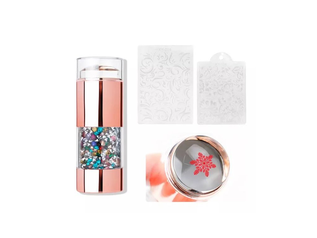 Razítko silikonové již nabízíme v krásném odstínu Rose Gold zdobené barevnými kamínky, silikon je v průhledném provedení, které Vám umožní přesnější obtisk motivu razítka na nehet.