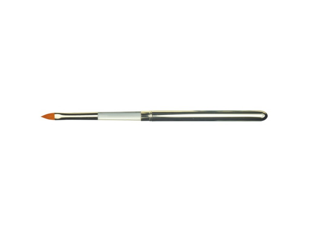Štětec na nehty Kolinsky č.6 - plochý, tvar kočičí jazýček, načervenalý syntetický vlas Gold Sable, ve stříbrné kovové skládací soupravě - ochranný kryt s otvorem a akrylátové držátko.
