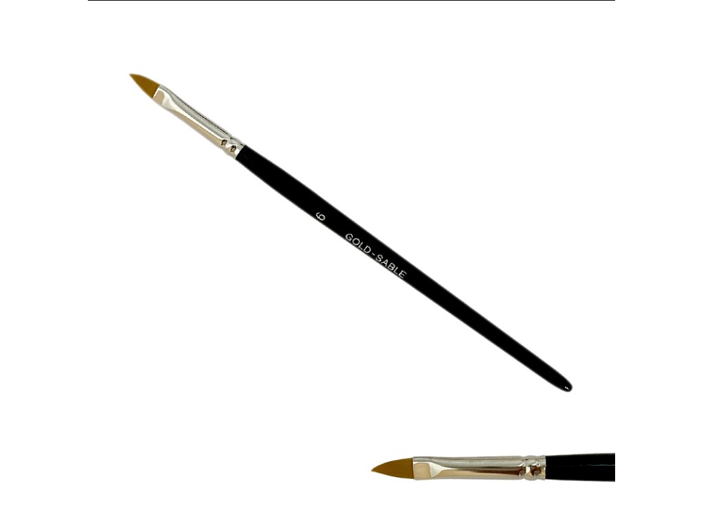 Štětec na nehty Gold Sable č.6 - plochý, tvar kočičí jazýček, načervenalý syntetický vlas - Gold Sable, bezešvá stříbrná zděř, leské černé lakované držátko.