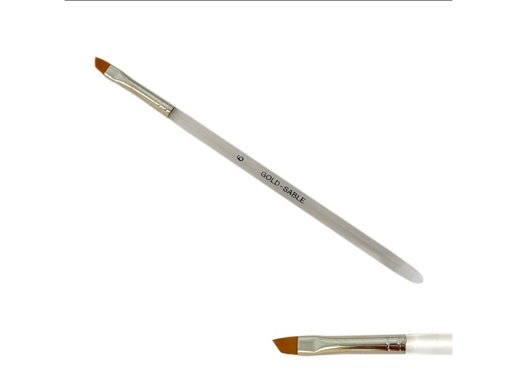Štětec na nehty Gold Sable č.6 - plochý, zkosený, načervenalý syntetický vlas - Gold Sable, bezešvá stříbrná zděř, akrylátové držátko.