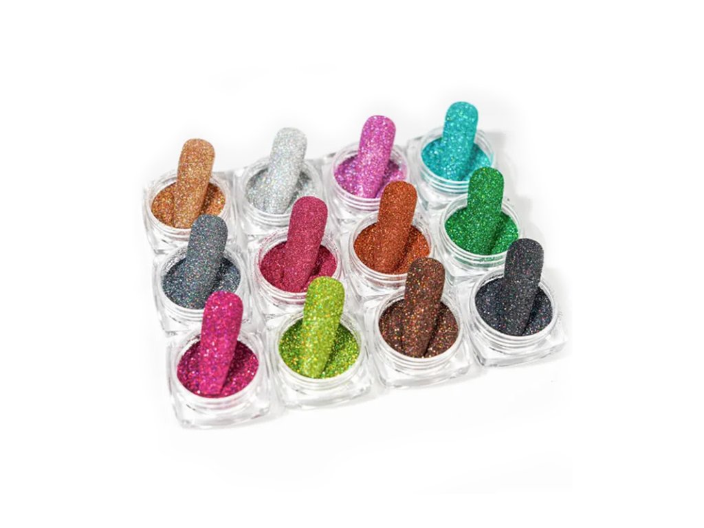 Zářivé barevné třpytky s duhovým odleskem, které jsou vhodné na vkládání do gelu, akrylu nebo Poly akrygelu nebo na Sugar efekt.