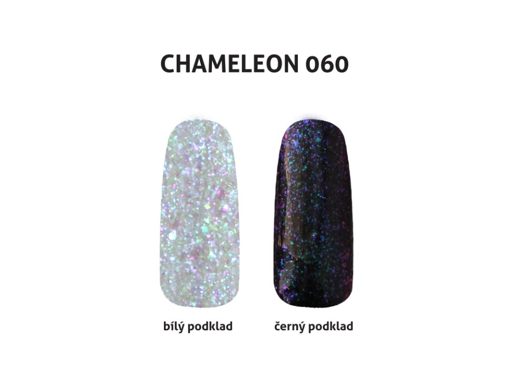 Barevný gel - Effect CHAMELEON obsahuje krásný jemný třpyt , který se změní dle jiného barevného podkladu ( barevného gelu ). Pozor! Tento gel je bezvýpotkový, pokud tedy budete chtít použít ještě lesk, stačí jemně zmatnit pěnovým pilníčkem kód 330201 a můžete aplikovat lesk.