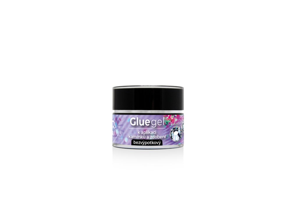 Čirý gel vhodný pro snadnou aplikaci kamínků a veškerých ozdob na nehty. Postup aplikace: Glue gel bez výpotku se aplikuje již na vymodelované – leskem zakončené nehty. Glue gel aplikujte na nehet podle potřeby, poté aplikujte do tohoto gelu ozdoby, kamínky apod., vytvrďte v lampě a máte hotovo.