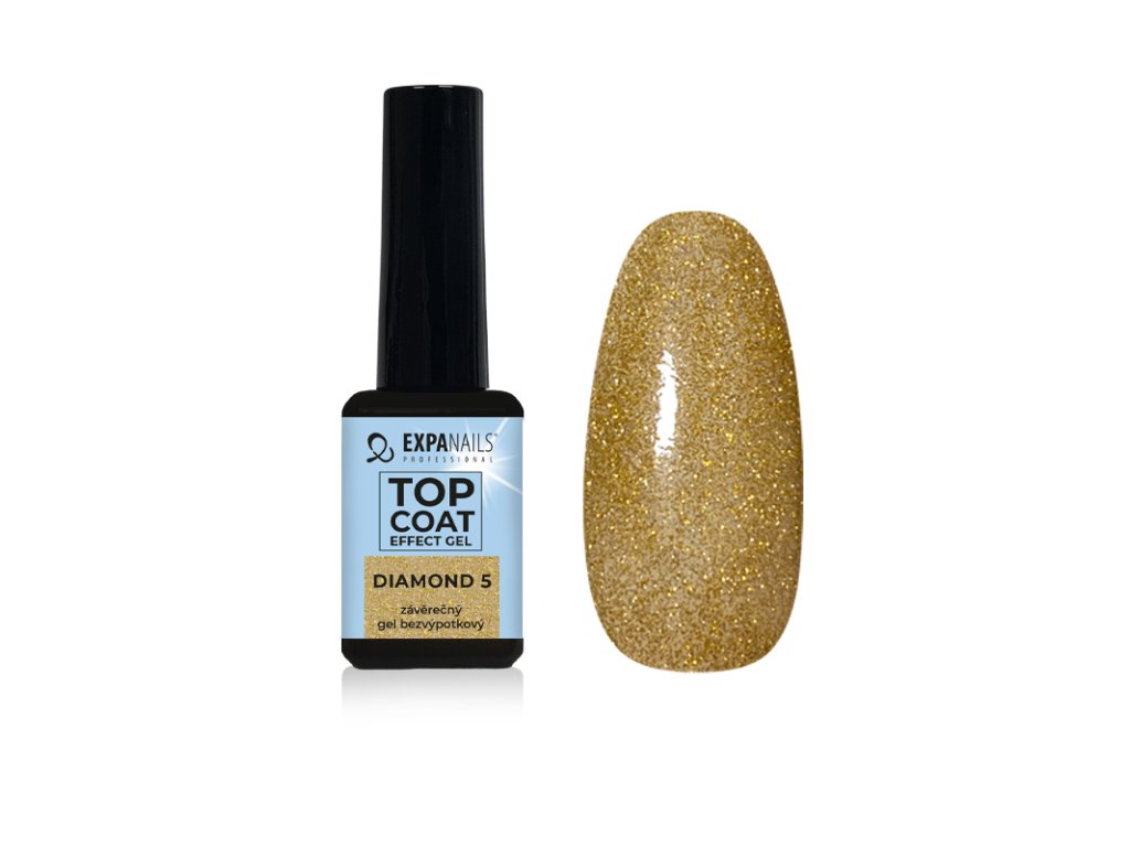 Závěrečný bezvýpotkový lesk, čirý se zlatým třpytem, který je velmi pružný a efektový lesk a obsahuje reflexní prvky. Oživí každou barvu a vytvoří na povrchu barevného gelu krásný třpytivý efekt. Lze použít na všechny druhy gel laku, gelu, akrylu nebo polygelu.
